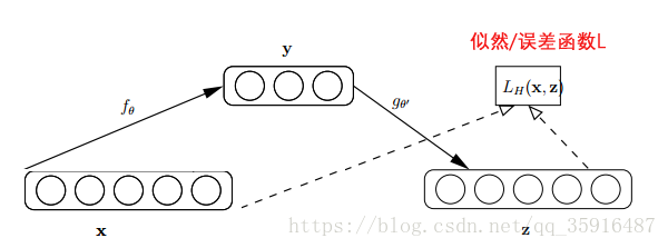然后这还没有完,文章的作者还引入了去燥自动编码器来优化模型,所以这里简单介绍下自动编码器:自动编码器基于这样一个事实:原始input(设为x)经过加权(W、b)、映射(Sigmoid)之后得到y,再对y反向加权映射回来成为z。通过反复迭代训练两组(W、b),使得误差函数最小,即尽可能保证z近似于x,即完美重构了x。那么可以说正向第一组权(W、b)是成功的,很好的学习了input中的关键特征,不然也不会重构得如此完美。结构图如下图所示: