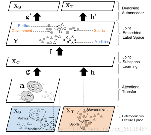 我们可以看到左下方的源数据集中的是关于政治或者药物的英文文本,然后右下角的目标数据集中的是关于政府和运动的文本所以它们的标签空间不重合,然后要注意的目标数据集中文本不是英文文本而是法语,意大利语等文本。也就是说他们的特征空间也是不重合的。那么首先源数据集中 通过一个映射g,目标数据集通过一个映射h投影到一个共同的连接子空间上,具体来讲就是Word2vet。Word2vet是我们这个领域在处理文本数据的一种常见的行为,Word2vet又有一些常用的方法本文采用的是skip-gram方法。我们大家都知道我们的神经网络没有办法去很好地直接地处理这些文本信息,而且这些文本相对来说维度比较低,所以更好的选择就是将其转化为向量,当然转化工程也要遵循一定的规则,就是在未转化前两个单词在语义上是比较近的那么在转化为向量后也要求二者的距离比较近。我之前看过一篇博客对Word2vet做了很详细的介绍但是很可惜没有收藏,一时也找不到后面找到了再推荐给大家吧。那么本文中做Word2vet除了是为了方便处理的基础上更重要的是可以减少两个数据集直接的特征差异(毕竟一个英文一个非英文)然后我们通过一个共同的映射f将二者投影到我们的标签空间中便完成了文本分类问题。