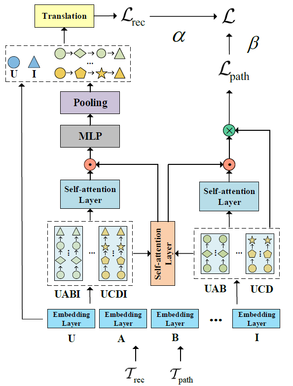 如果连接用户 和项目 的元路径 指示 将与 交互的可能性很高,则 应该接近 . 与基于翻译的知识图谱嵌入(头实体和尾实体的嵌入属于同一空间)不同,用户嵌入 、元路径嵌入 和项目嵌入 属于 MTRec 中三个不同的向量空间。因此,与基于翻译的知识图谱嵌入方法相比,MTRec 采用了更加异构的翻译机制来建模三向交互。