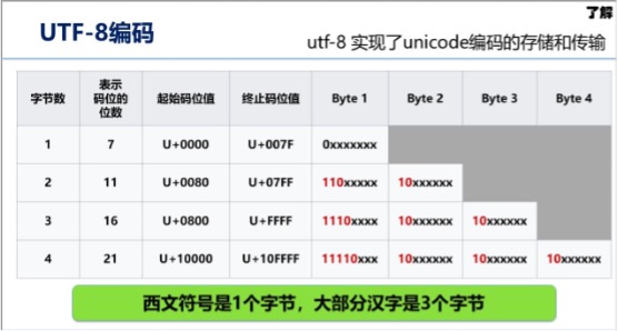 ——UTF-8:可变长编码西文字符 1 字节,以 0 开头