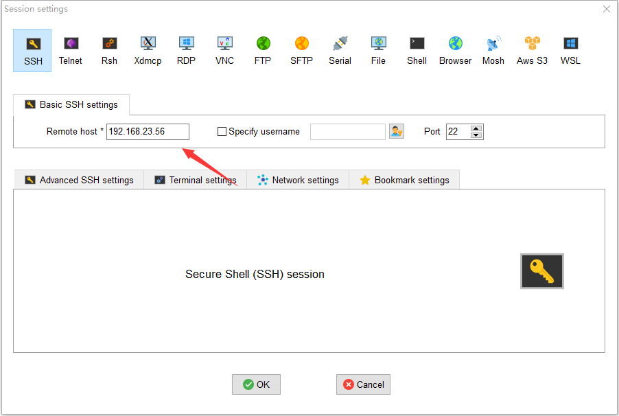 3打开windows终端软件 MobaXterm ,点击session,选择ssh,输入访问地址和端口号,点击OK