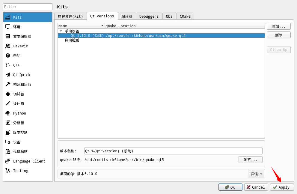 选择Kits---编译器,确认是否识别出之前安装的交叉编译工具,下图表示是识别成功