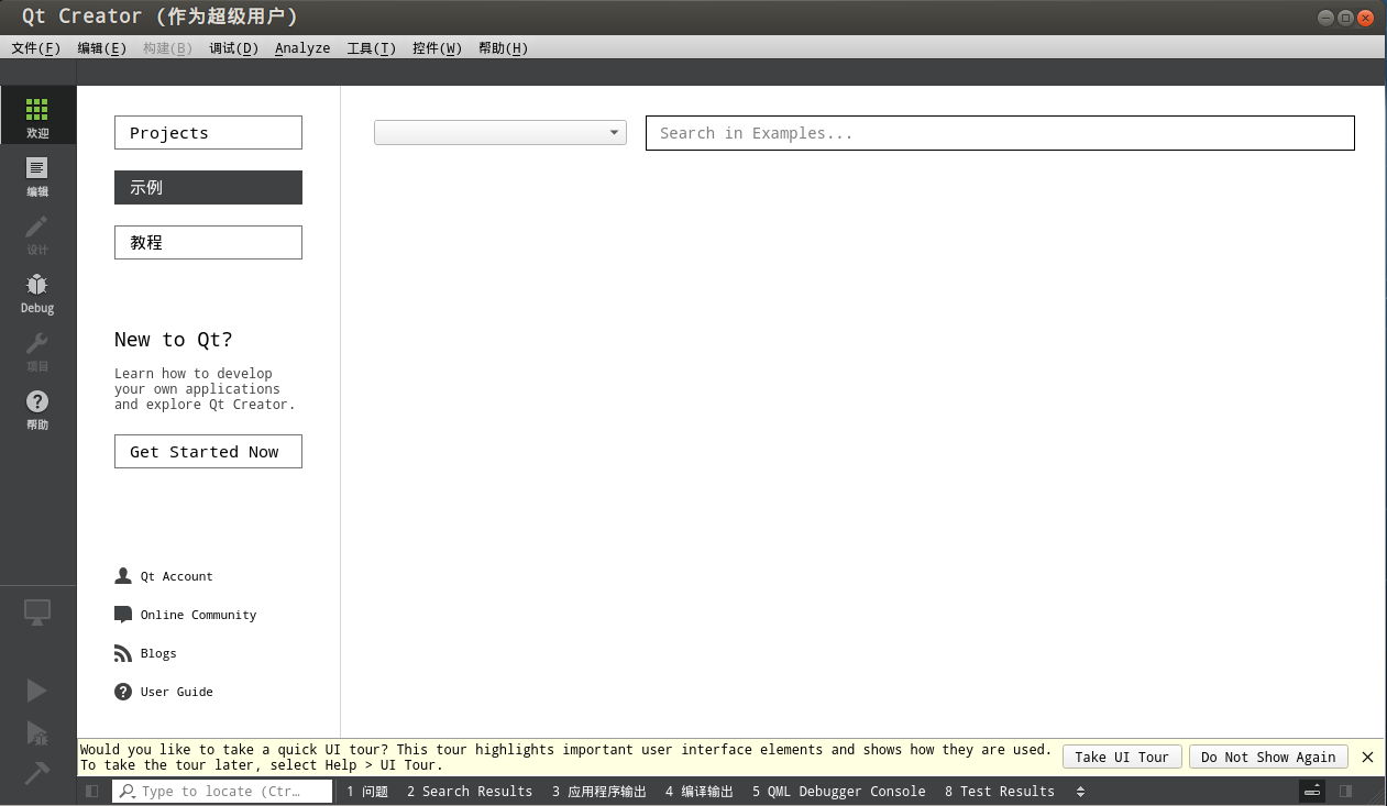 安装完毕后,不推荐利用桌面快捷方式启动qtcreator,中间会涉及到很多权限问题,推荐将qtcreator程序路径加入到系统环境中,或者进入qtcreator的bin目录下利用终端指令打开,可以有效避免权限问题