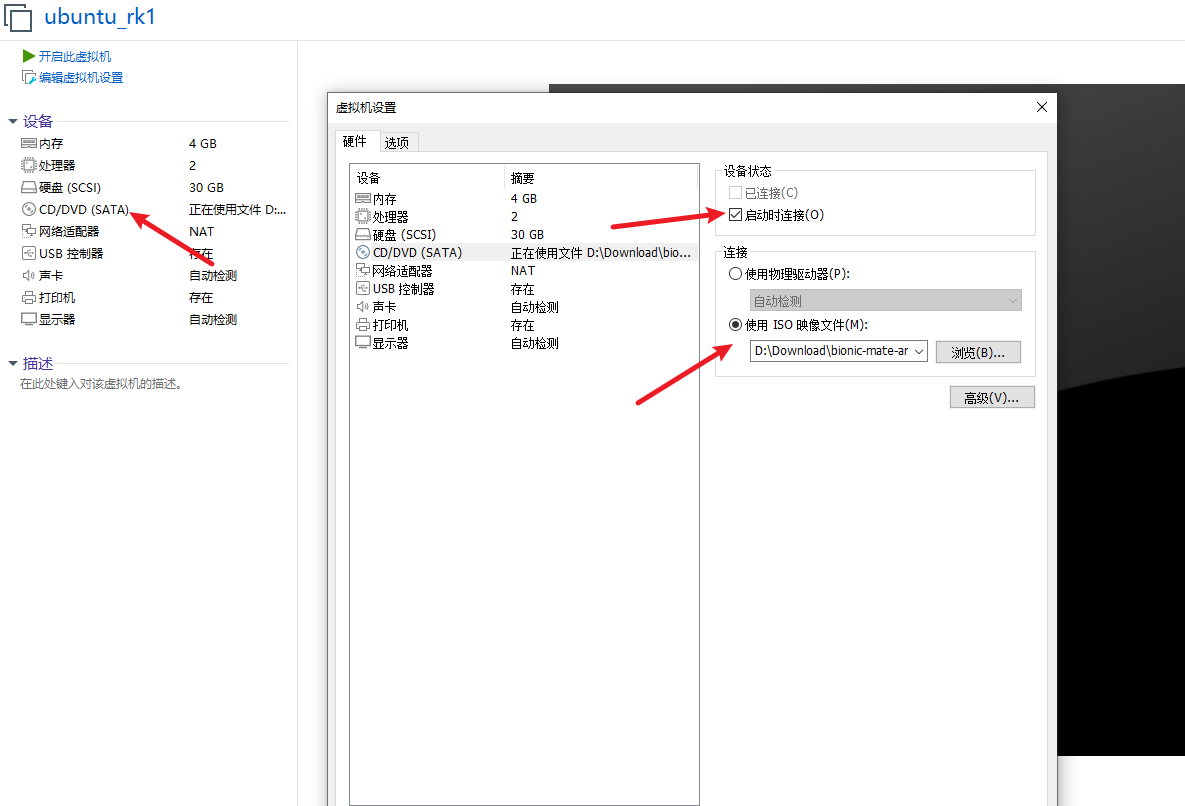 选择刚刚创建的虚拟机,然后点击CD/DVD(SATA)配置,选择使用ISO映像文件,输入要安装的映像文件路径,勾选启动时连接,然后点击确定。