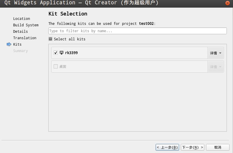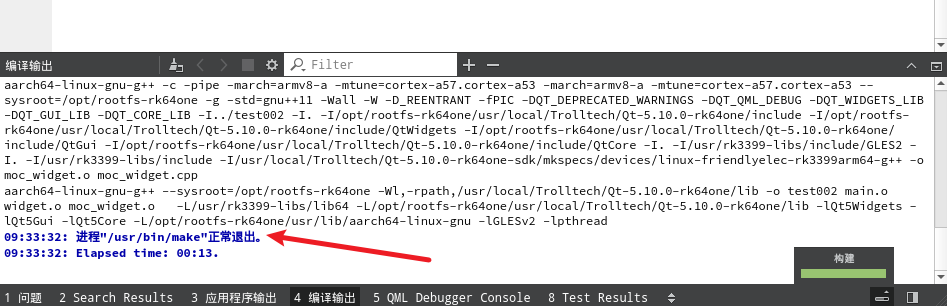 在qtcreator中创建一个简单的widget项目(本例子项目名为test002),在编译选择这里选择之前配置的rk3399配置,构建