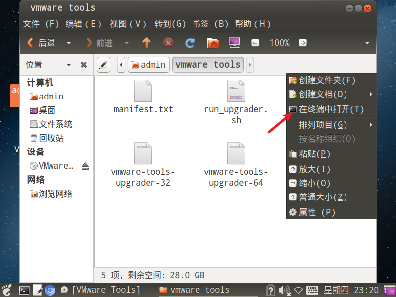 将VMware光驱的内容全部拷贝至该文件夹内,然后在新文件夹内部空白处右键选择--在终端中打开