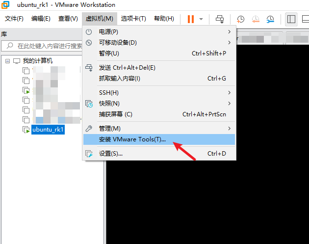 VMware Tools安装包可以直接通过上方菜单进行安装。点击虚拟机软件上方的虚拟机,选择安装VMware Tools(T)...