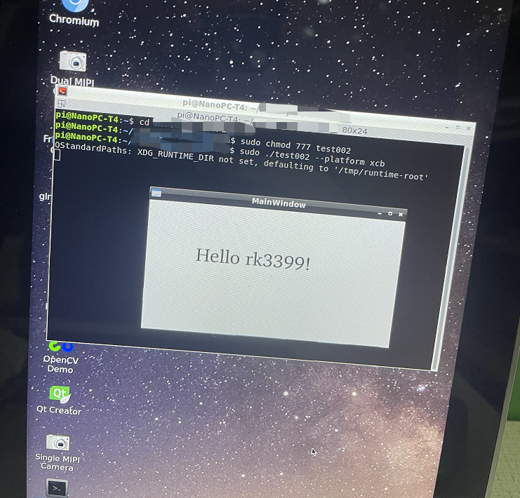 将生成的执行程序和依赖库一同拷贝到rk3399的板子上,放置于同一个目录下,然后赋予权限后运行