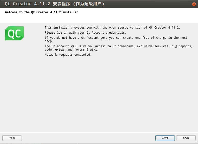 Qtcreator的安装和windows版本的如出一辙,网上搜下就有了,很简单,就不过多獒述了,需要注意的是高本版的安装程序可能需要校验用户,去qt官网注册一个即可