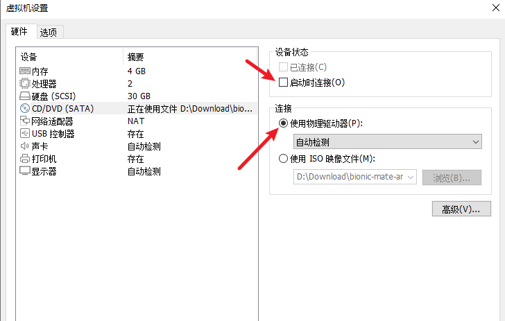 然后重新点击CD/DVD(SATA)配置,把启动时连接的勾去掉,然后选择使用物理驱动器