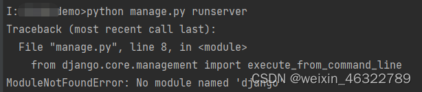以上就是傲娇酸奶最近收集整理的关于ModuleNotFoundError: No module named ‘django‘的全部内容,更多相关ModuleNotFoundError:内容请搜索靠谱客的其他文章。