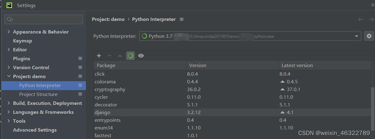 问题描述: 在pycharm中启动Django项目时,显示ModuleNotFoundError: No module named 'django' , 但是在setting中检查存在django