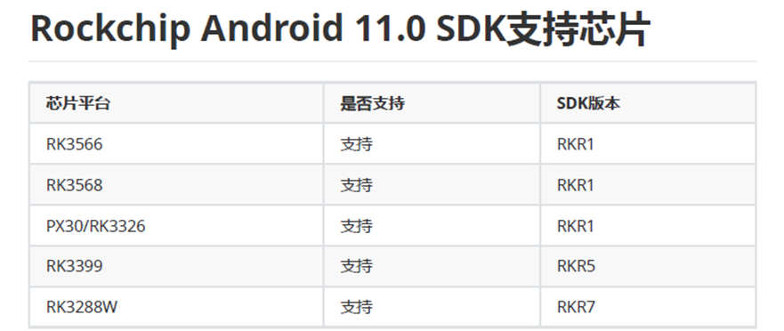 RK的Android11,这个系统一开始是为RK3566/RK3568适配的,而之后,RK也适配了几个旧平台,如下图所述
