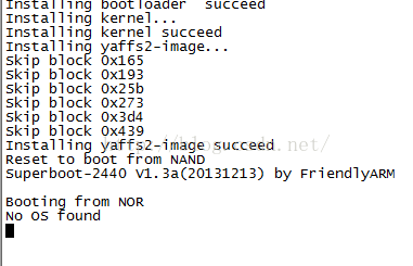 原因是commandline没有填写,由于烧录的superboot2440.bin为友善之臂自己制作的bootloader,不向用户提供源码,所以要用minitools烧录的话,格式化之后commandline是必填的,如果没有选择格式化nandflash,此值可以不填,默认用上一次的command。