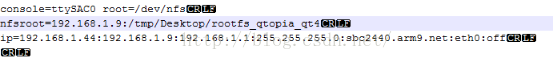 console=ttySAC0 root=/dev/nfs nfsroot=192.168.1.9:/tmp/Desktop/rootfs_qtopia_qt4 ip=192.168.1.44:192.168.1.9:192.168.1.1:255.255.255.0:sbc2440.arm9.net:eth0:AC0