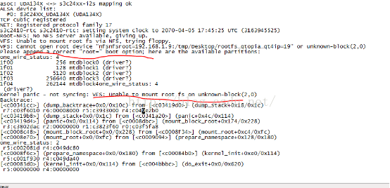 看红色第一处提示,提示root的参数有问题,原始是由于我们用的是换行符分隔的,所以看上一行提示,它的含义是 root的参数系统截取了nfsnfsroot=192.168.1.9:/tmp/Desktop/rootfs_qtopia_qt4ip=19,所以系统才认为系统的参数不正确。