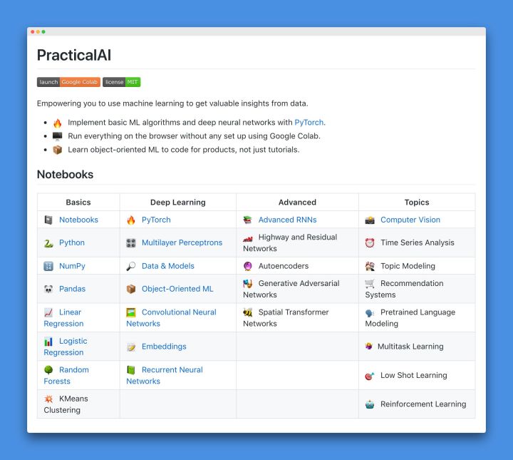 PracticalAI里面的内容,分为四个部分,并将持续更新:基础 (Basics),深度学习入门 (Deep Learning) ,深度学习高阶 (Advanced) ,以及具体应用 (Topics) 。注:此处非直译。