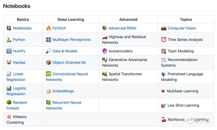 · 基础部分,除了有Python指南、笔记本用法,以及Numpy、Pandas这些库的用法,还有线性规划、逻辑规划、随机森林、k-means聚类这些机器学习的基本技术。