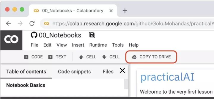 第五步,点击工具栏里的COPY TO DRIVE按钮,就可以在新标签页里打开笔记本了。