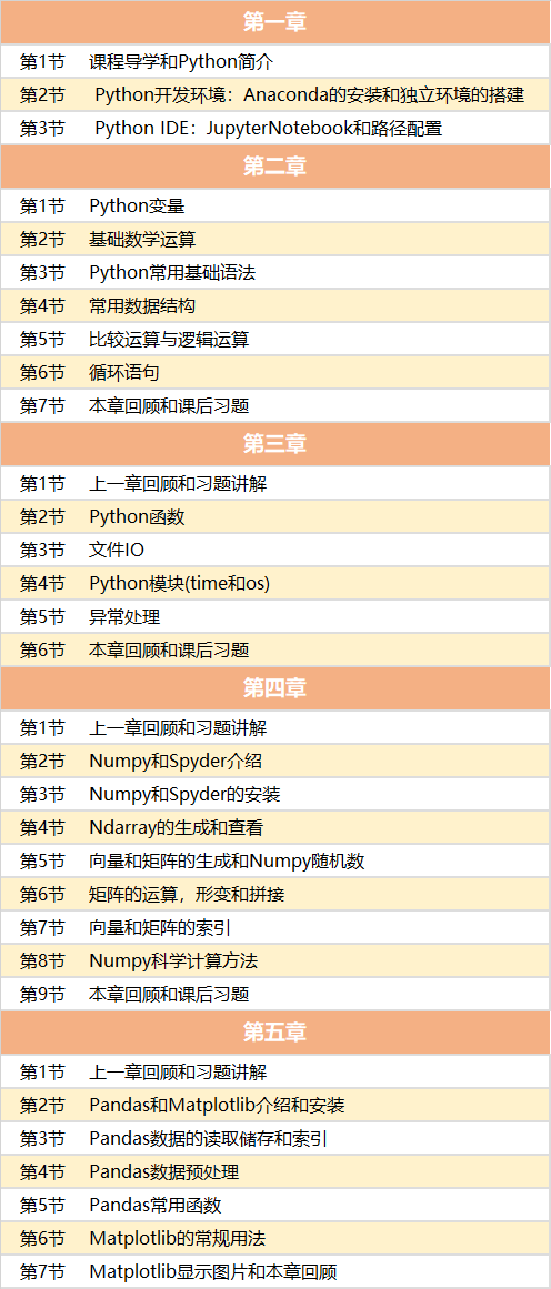 2、不仅包含语法知识,还会涵盖 Numpy、Panadas、Anaconda、Jupyter Notebook等常用工具,带你提前接触数据分析和人工智能领域。