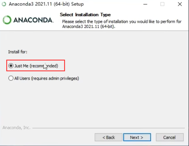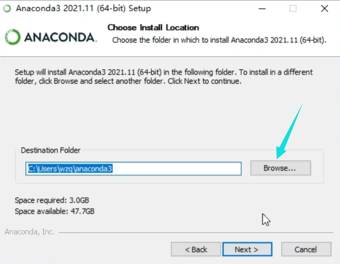 5、可以修改为其他盘,例如D盘Anaconda文件夹(路径尽量不要含有中文)
