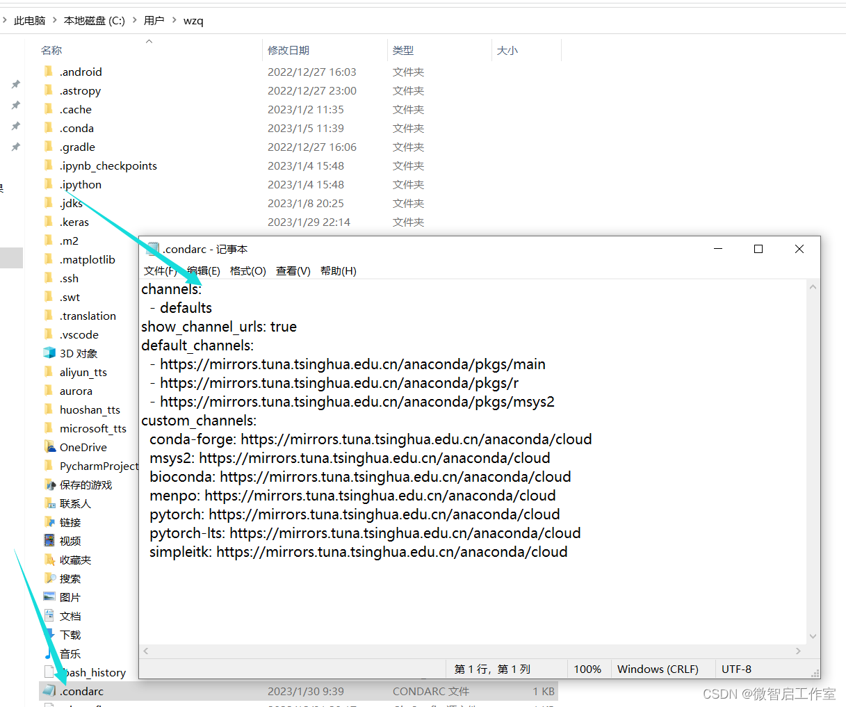 4、右键以记事本方式打开.condarc文件,把里面的内容,全部替换为下方的内容,保存退出。