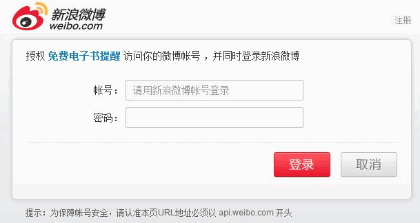 获得微博授权URL,如第2行,用默认浏览器打开后会要求登陆微博,用需要授权的账号登陆,如下图