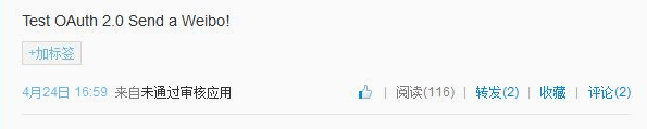 用set_access_token保存授权。往下就可以调用微博接口了。测试发了一条微博