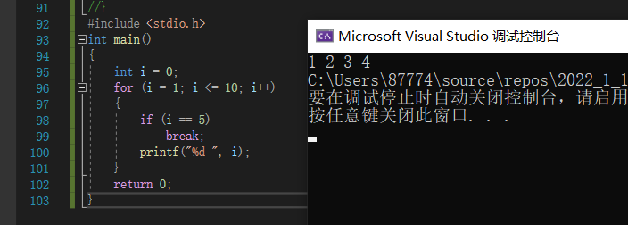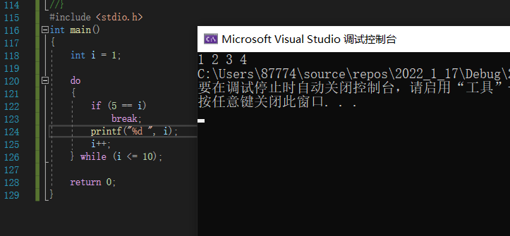 当 break 语句出现在一个循环内时,循环会立即终止,且程序流将继续执行紧接着循环的下一条语句。
