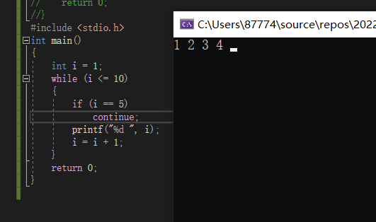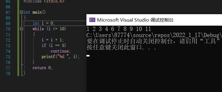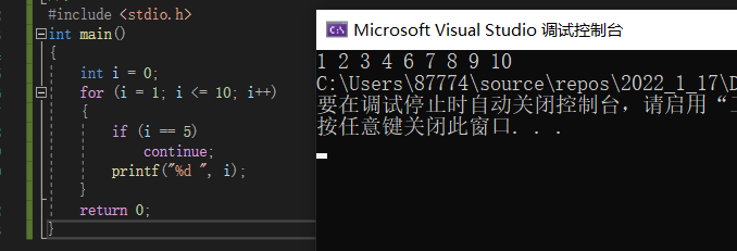 整体上与在while循环中差别不大,不过在for循环中使用continue不会跳过调整部分,不会出现像while循环中不当使用continue导致的死循环。