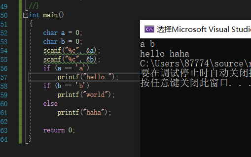 当输入 a b时输入缓存区实际输入了3个字符 'a'、' ' 、‘b’。当使用scanf("%c", &a)时‘a’被读取,