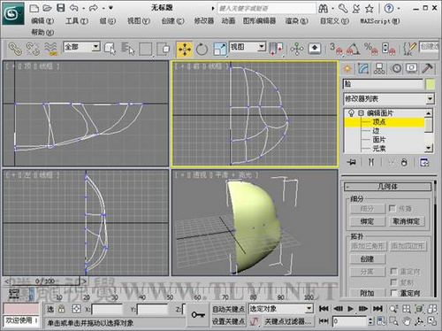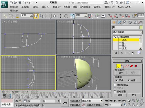 (3)进入“顶点”子对象层,在“前”视图编辑对象顶点,使其呈现半个脸部的形状。