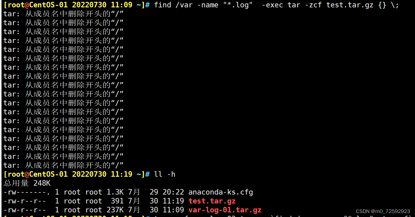 [root@CentOS-01 20220730 11:09 ~]# find /var -name "*.log" -exec tar -zcf test.tar.gz {} ;
