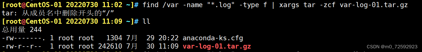 [root@CentOS-01 20220730 11:02 ~]# find /var -name "*.log" -type f | xargs tar -zcf var-log-01.tar.gz