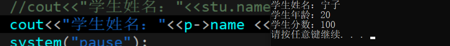 cout<<"学生姓名:"<<p->name <<"n"<<"学生年龄:"<<p->age <<"n"<<"学生分数:"<<p->score<<endl;