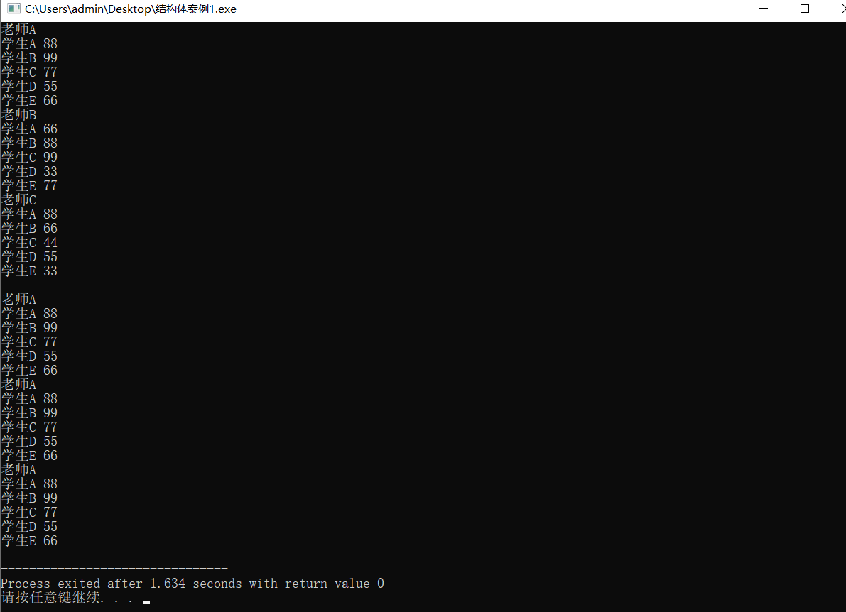 案例描述:学校中一位老师带五个学生,总共有三名老师,设计学生和老师的结构体 在老师结构体中包括老师姓名和五位学生的结构体,学生结构体包括姓名和考试分数,创建数组保存三位老师,通过函数给老师和学生赋值,通过函数实现输出老师数据以及学生数据。