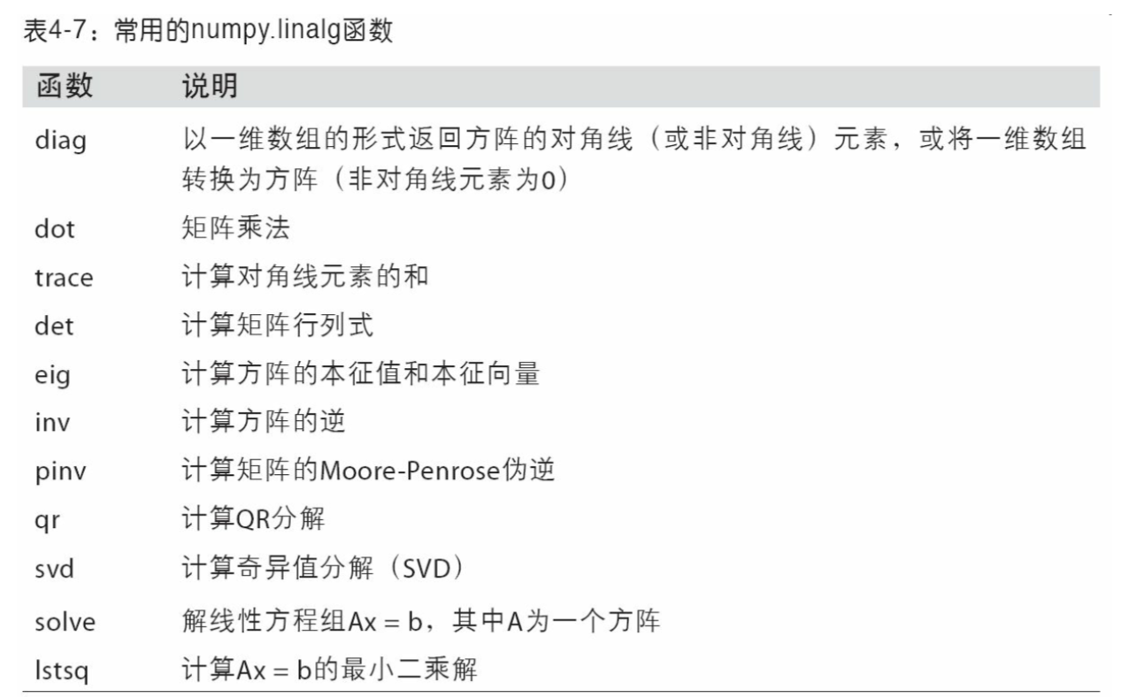 numpy.linalg中有一组标准的矩阵分解运算以及诸如求逆和行列式之类的东西,和Matlab使用的是相同的行业标准线性代数库。