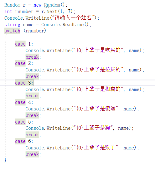 这个例子会输出6次的"随机数".利用switch 下的 case 和 break 必须用一对大括号{}括起来。 当switch后面括号内“表达式”的值与某个case后面的“常量表达式”的值相等时,就执行此case后面的语句。执行完一个case后面的语句后,遇上break就会跳出switch语句。