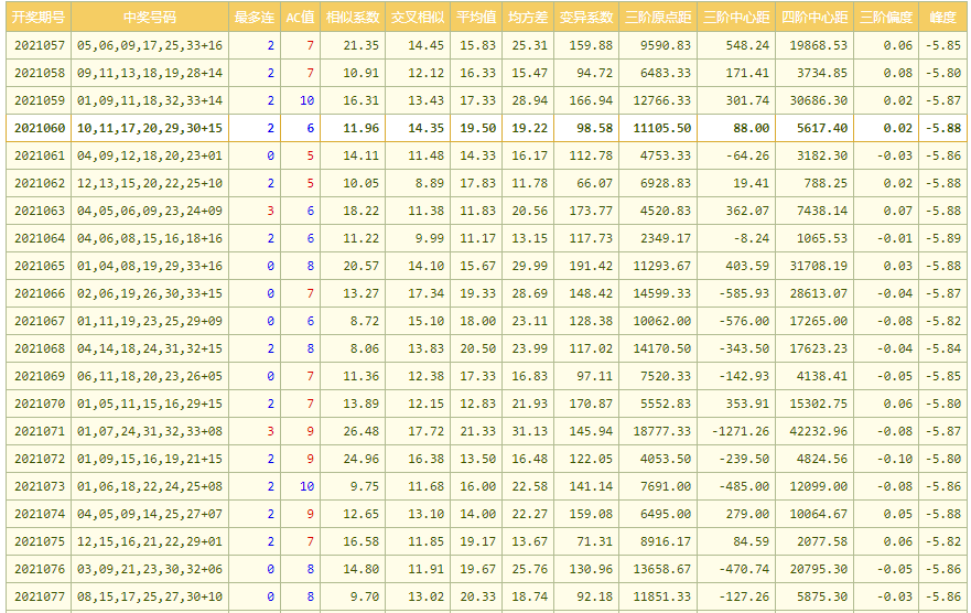 (1)统计:首先需要对数据集进行计算,包括和值、均值、标准差、均方差、跨度(最大号-最小号)、奇偶比(奇数个数比偶数个数,后面类似)、大小比、质合比(质数与合数的比。有个数学问题:1是质数?或是合数?)等等,一般的彩票网站都可以提供几十种统计数据。这个都是数学哈!