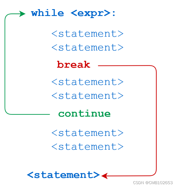 while循环的语法结构:(不同行代码之间的层次关系通过缩进来体现,多行执行语句顺序依次是从上到下)