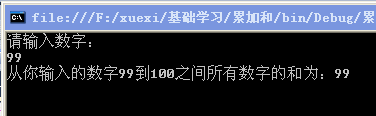 Console.WriteLine("从你输入的数字{0}到100之间所有数字的和为:{1}",number ,sum);