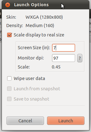 所以,还是建议你修改一下,采用自定义分辨率吧,比如我用的480*300或者640*400效果都可以接受。当然还有一种方法是在模拟器的start...窗口选择:Scale display to real size也可以,当然默认3英寸太小了,调节成7英寸或者5英寸就效果不错了,但是这个模式速度比较慢,而且看不太清楚,不推荐。如下图所示: