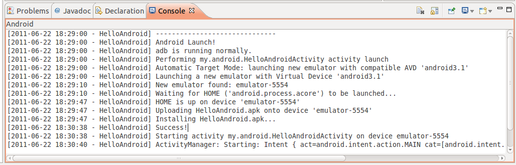 好了,一切都可以了,现在可以Run了,当然Run as成 android application了,Eclipse会自动启动模拟器,自动安装apk,自动运行的。
