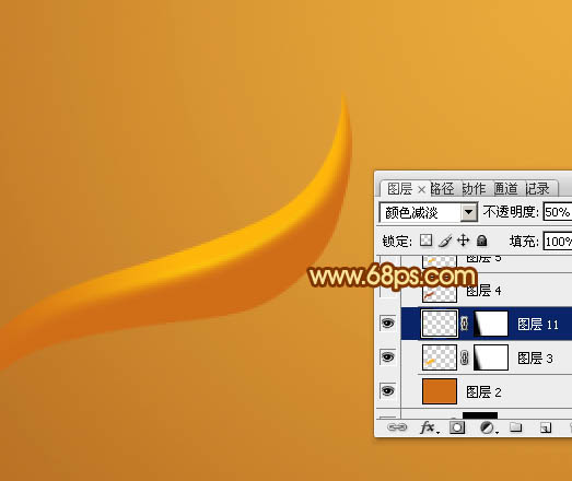 8、新建一个图层,用钢笔勾出底部边缘的高光选区,羽化2个像素后填充橙黄色,取消选区后添加图层蒙版,用黑色画笔把左侧部分的过渡擦出来,如下图。