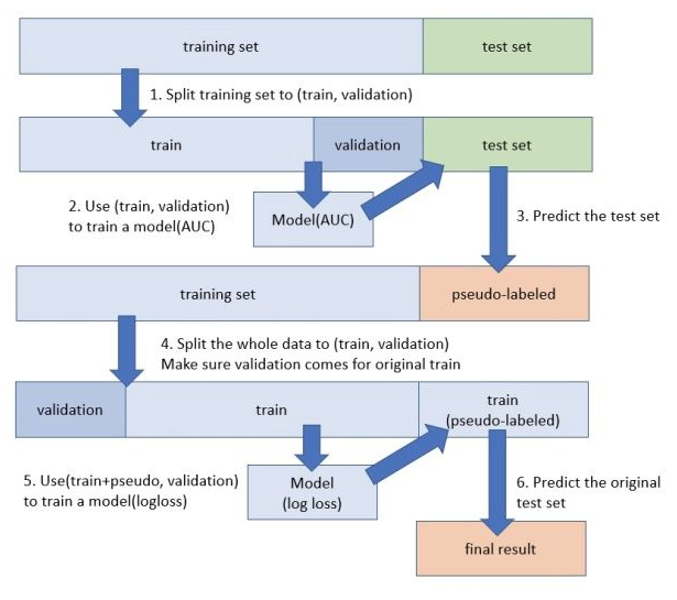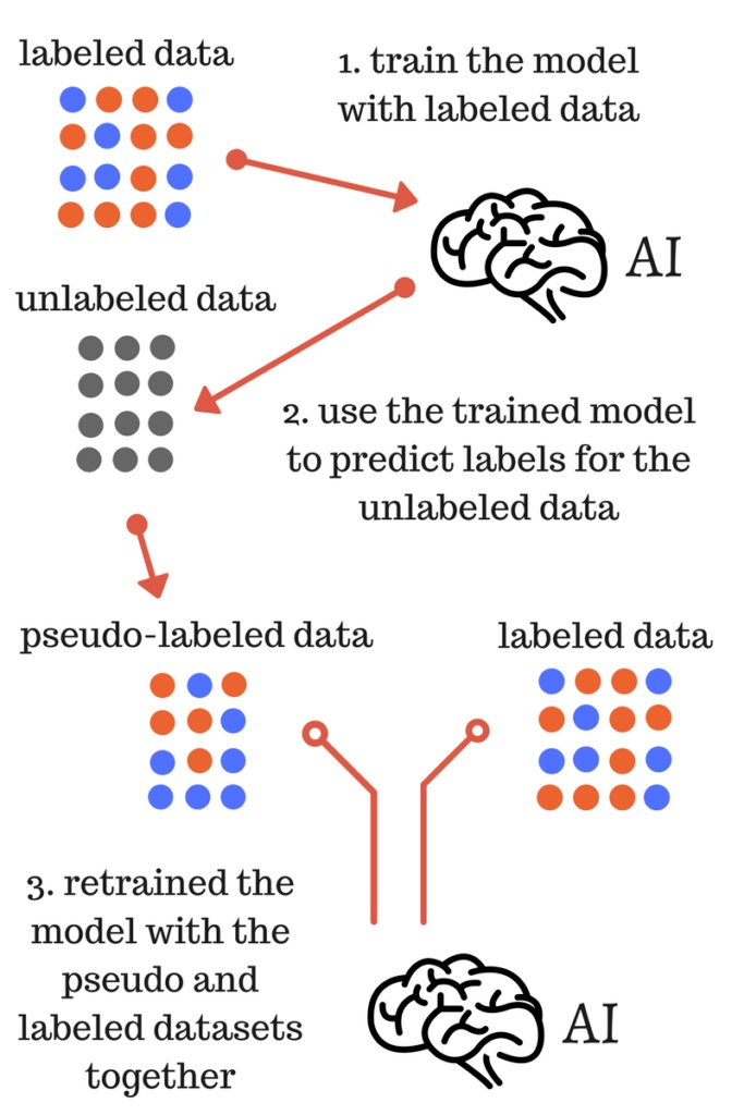伪标签是使用标记的数据模型预测未标记数据并进行标记的过程。 首先,模型已经训练了包含标签的数据集,该模型用于为未标记的数据集生成伪标签。 最后,将数据集和标签(原始标签和伪标签)组合在一起以进行最终模型训练。 之所以称为伪(意味着虚幻),是因为它们可能是真实标签,也可能不是真实标签,并且是通过我们基于类似的数据模型生成的标签。