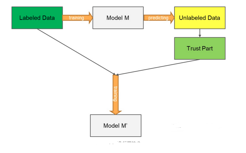 该方法的主旨思想其实很简单。首先,在标签数据上训练模型,然后使用经过训练的模型来预测无标签数据的标签,从而创建伪标签。此外,将标签数据和新生成的伪标签数据结合起来作为新的训练数据。