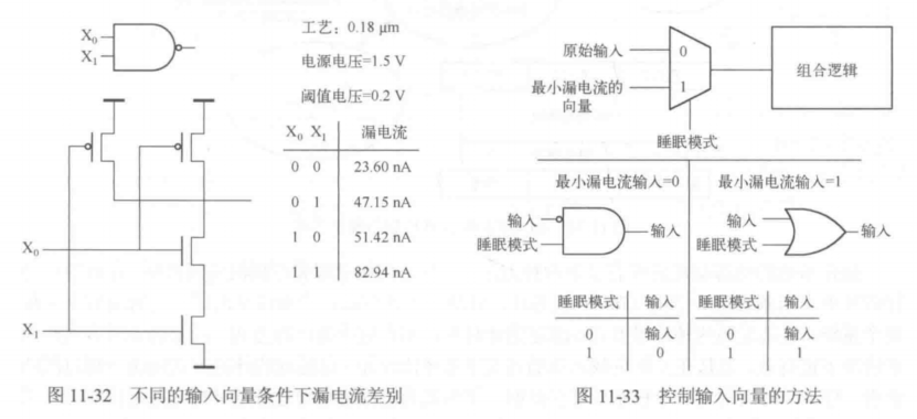 系统在睡眠状态下,控制输入向量可以明显减少系统的漏电流(选择最小漏电流的向量作为组合逻辑的输入)。