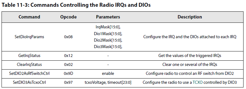 为了能够让射频芯片SX1261/2以异步的方式主动向MCU通知其内部的状态信息,SX1261/2提供了一组可以配置的GPIO口DIO1-N。其中有两个GPIO的功能极其重要: