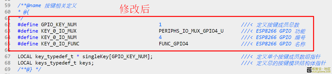 接下来修改按键,这个按键的作用是触发小E进入联网模式,配合手机APP获取路由器的SSID和密码。由于生成的工程包含的按键驱动是以机智云官方Gokit3 SOC版为模板的,我们小E的按键连接的管脚和Gokit是不一样的,因此需要修改。