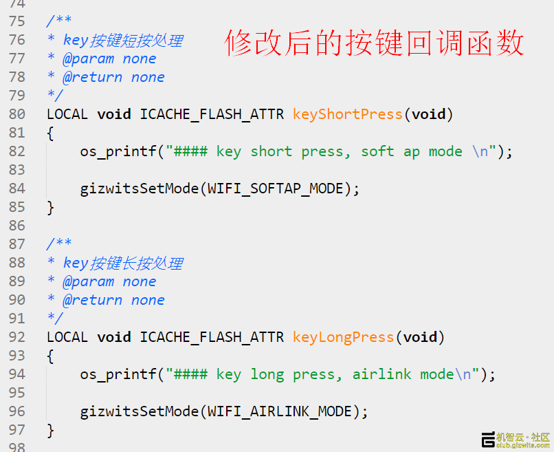 int8_t ICACHE_FLASH_ATTRgizwitsEventProcess(eventInfo_t *info, uint8_t *data, uint32_t len),在里面如下位置添加对应代码: